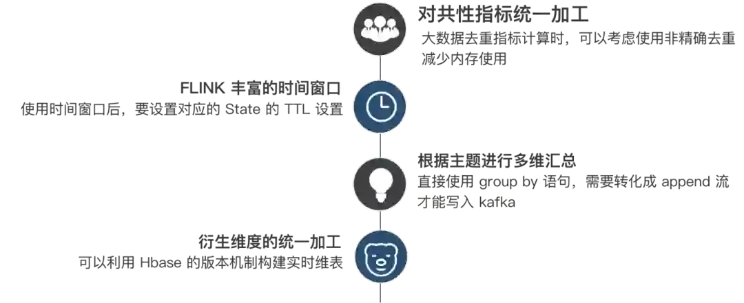 第一点是对于一些共性指标的加工,比如说 pv、uv、交易额这些运算,我们会在汇总层进行统一的运算。另外,在各个脚本中多次运算,不仅浪费算力,同时也有可能会算错,需要确保关于指标的口径是统一在一个固定的模型里面的。本身 Flink SQL 已经其实支持了非常多的计算方法,包括这些 count distinct 等都支持。