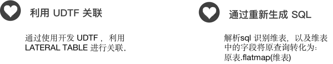 但是这个操作要求使用者有很多周边的系统来进行配合,首先需要能解析 SQL ,同时还能识别文本,记住所有维表的信息,最后还要可以执行 SQL 转化,所以这套方案适合一些已经有成熟的基于 Flink SQL 的 SQL开发框架的系统来使用。如果只是单纯的写封装的代码,建议还是使用 UDTF 的方式来进行关联会非常的简单,而且效果也是一样的。