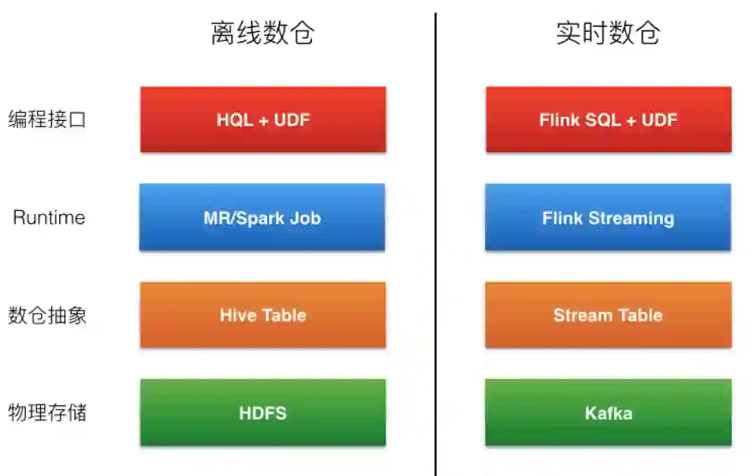 离线处理的执行层面一般是 MapReduce 或者 Spark Job ,对应到实时数仓就是一个持续不断运行的 Flink Streaming 的程序。