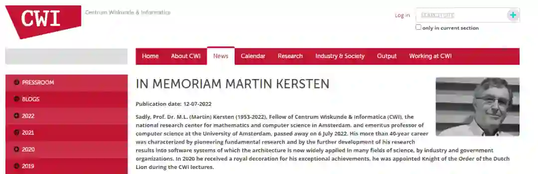 7月12日,阿姆斯特丹国家研究机构Centrum Wiskunde & Informatica (CWI)官网发布讣告,宣布其研究员、阿姆斯特丹大学计算机科学荣誉教授、MonetDB Solutions首席执行官M.L. (Martin) Kersten博士教授已于2022年7月6日逝世。