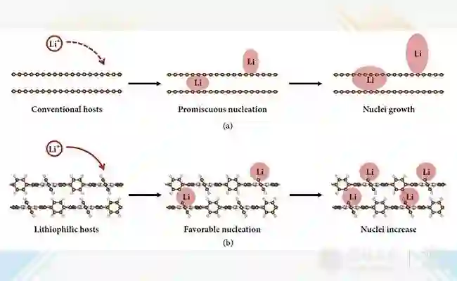 在具有不同亲锂性的骨架材料上金属锂形核与生长情况示意图。(a)使用传统的亲锂性较差的纳米碳骨架材料,金属锂随机形核并生长,最终发展为金属锂枝晶。(b)使用具有超高亲锂性的卟啉有机骨架材料,金属锂优势形核并数量增多,最终实现金属锂的均匀沉积并抑制金属锂枝晶的产生。