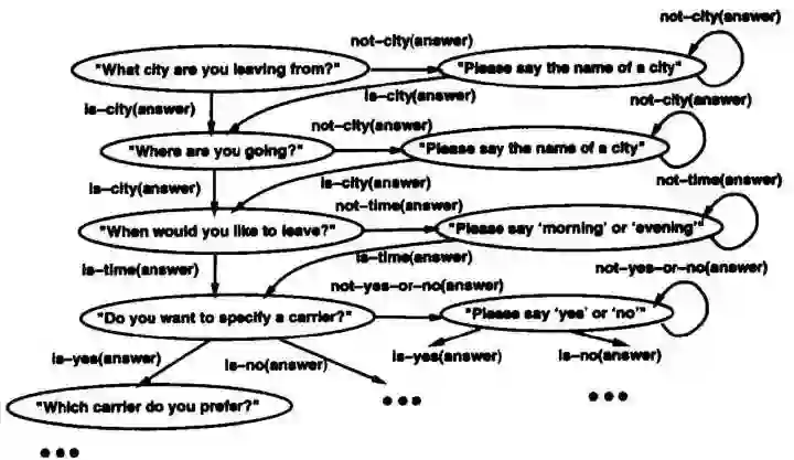 Trees and FSM-based approach 通常把对话建模为通过树或者有限状态机(图结构)的路径。相比于 simple reactive approach,这种方法融合了更多的上下文,能用一组有限的信息交换模板来完成对话的建模。