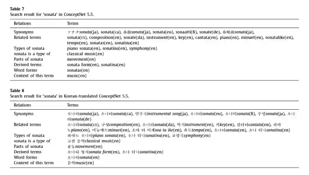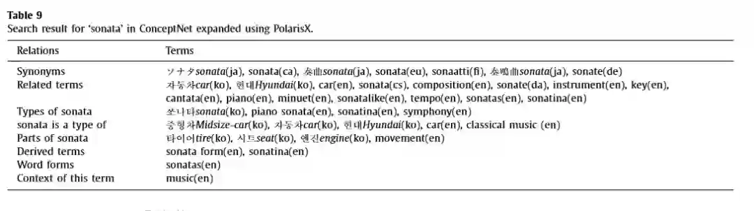 使用ConceptNet 5.5(英语/韩语)以及使用PolarisX扩充的ConceptNet 5.5对比其中一词“Sonata”(一般视作一个音乐术语,在韩国则还有相同名字的汽车品牌)