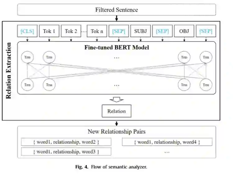 新关系(主要指关键词之间的关系)的抽取是通过BERT模型实现的(作者在这里使用的是BERT-base,Multilingual Cased预训练模型,支持104种语言),微调使用TACRED数据集实现。