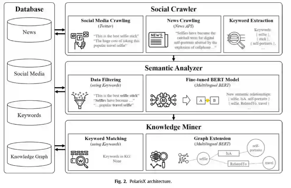 为了使计算机理解人类语言,并且实现推理,人类知识需要被表示并储存为能够被计算机处理的形式。知识图谱(KG)被设计为一种反应词及词间关系的结构形式。但是目前的知识图谱存在两个限制因素:其一是对于大部分人类语言来说,图谱的规模和范围存在局限性;其二则是新词跟进。为了解决这些问题,本文提出PolarisX,一种通过实时抓取分析网络新闻和社交媒体实现自动扩展的知识图谱,利用微调的BERT模型构建无语言依赖性的知识图谱。基于BERT的关系抽取模型被用来抽取新的关系,并将它们添加到知识图谱中。作者验证了PolarisX的novelty与准确性,确认其新词处理能力以及“无语言依赖性”。