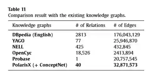 与DBpedia,YAGO等现有KG的对比来看,ConceptNet+PolarisX具有更多的边,作者认为这粗略的表明具有更加丰富的知识(A higher total number of edges roughly means a richer knowledge base