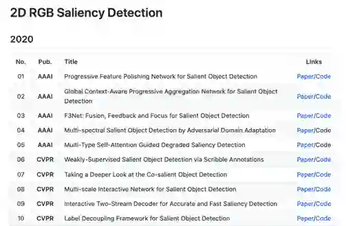 今天给大家推荐一个优秀的Github项目,总结了近几年的显著性目标检测相关顶会顶刊论文以及相应代码。尤其适合初学者的论文阅读,以及高级研究员的文献检索和代码查找。