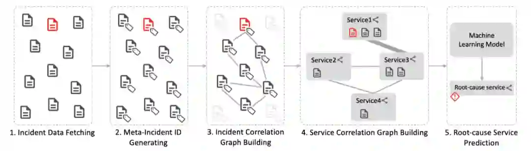 COT 的思路是,对于历史上的每一个 Outage,研究员们都挖掘与该 Outage 相关的故障之间的关联信息,并以服务为单位,将故障之间的关联信息进行聚合,然后,以 Outage 中服务之间的故障关联为特征,以 Outage 的根因服务为标签,训练机器学习模型。在新的 Outage 发生后,研究员们可以通过历史故障的关联信息,快速找到与该 Outage 相关的故障,并用相同的方法对这些故障进行聚合与特征提取,再利用先前训练好的机器学习模型来预测其根因服务。