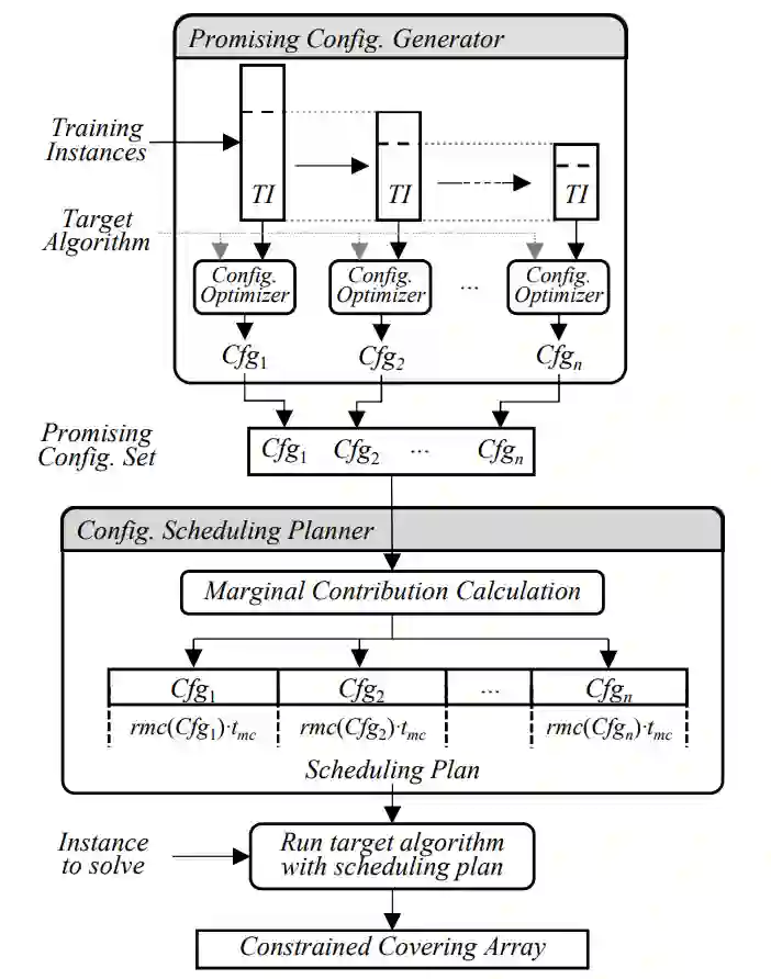 AutoCCAG 的架构如图1所示。给定一个可配置的 CCAG 算法 a,AutoCCAG 的配置优化器会采用自动算法配置技术用于确定算法 a 的优化参数;然后 AutoCCAG 的有效配置生成器的会生成算法 a 的多个配置并且使得这些配置之间有很强的互补性;之后,AutoCCAG 的配置调度规划器会采用自动算法选择技术构造一个关于算法 a 的配置调度规划。最终,AutoCCAG 通过采用该配置调度规划用来求解给定的 CCAG 问题实例,并且生成相应的约束覆盖阵列。