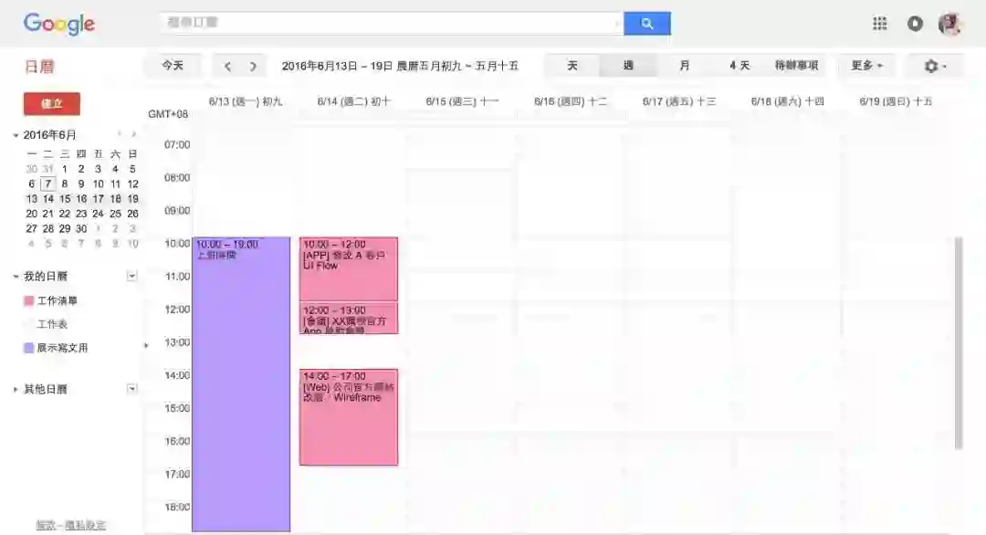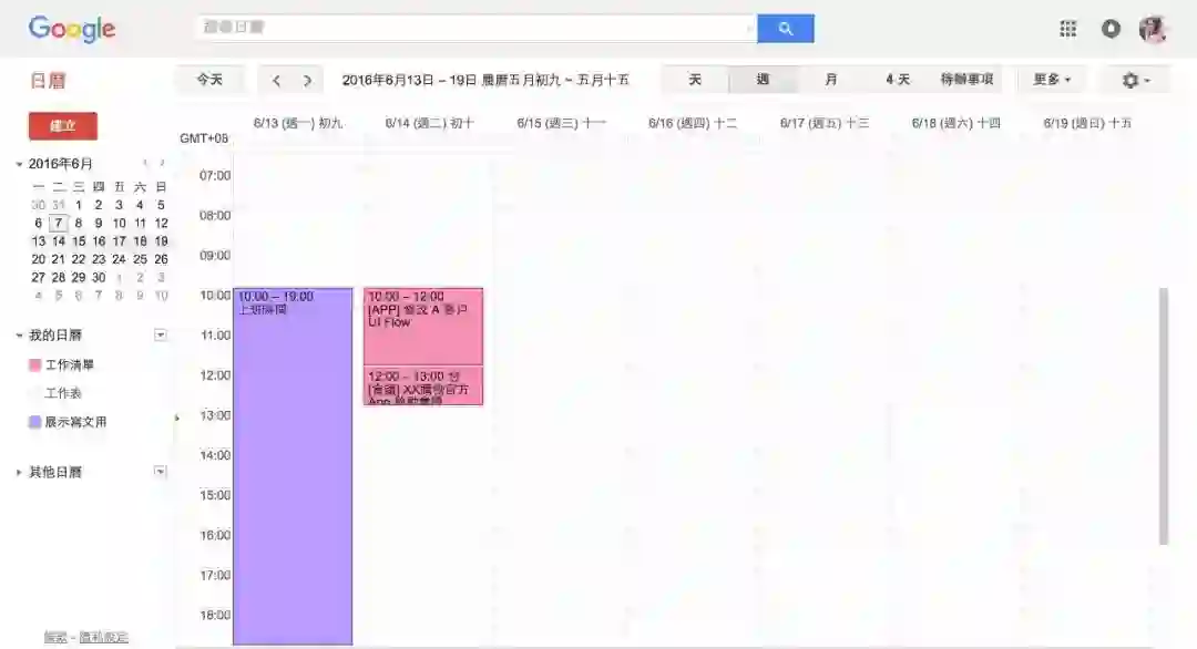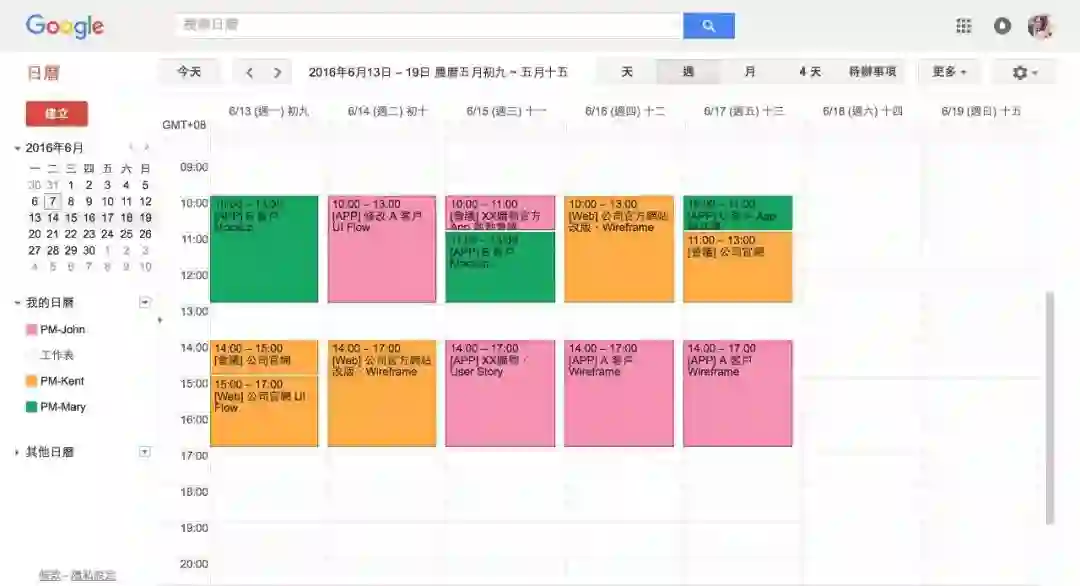 我在接案公司的时候,一周经手5~8个不同的Case、对上至少4名PM是常态。此时Calendar允许多人编辑非常好用。把Calendar的名称设成PM的名字,每个人颜色都不一样。谁在某个时段派了什么工作给你一目了然。