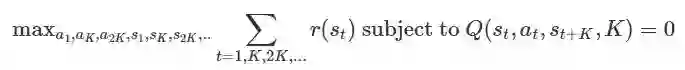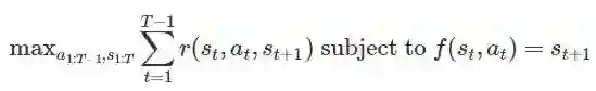 。给定这个动态模型,有多种基于模型的算法。对于本文而言,我们考虑执行以下优化的方法来选择一系列操作和状态以最大化奖励: