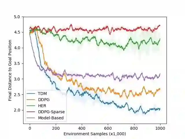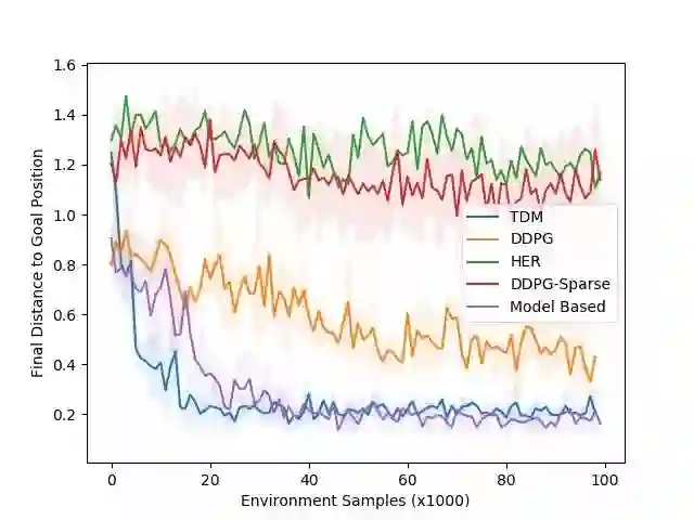 上图所示的学习曲线展示了最终目标的距离与样本的数量直接的关系(越低越好)。我们的仿真以 20Hz 控制机器人,这表示 1000 步对应于现实世界的 50 秒。这种环境的动态相对容易学习,这意味着基于模型的方法应该很出色。正如预期那样,基于模型的方法(紫色曲线)快速学习——大约 3000 步,或 25 分钟——且表现良好。TDM 方法(蓝色曲线)也可以快速学习——大约 2000 步或 17 分钟。无模型的 DDPG(无 TDM)基线最终解决了这个任务,但需要更多的训练样本。TDM 方法能够如此快速学习的一个原因就是它的有效性是基于模型的伪装方法。