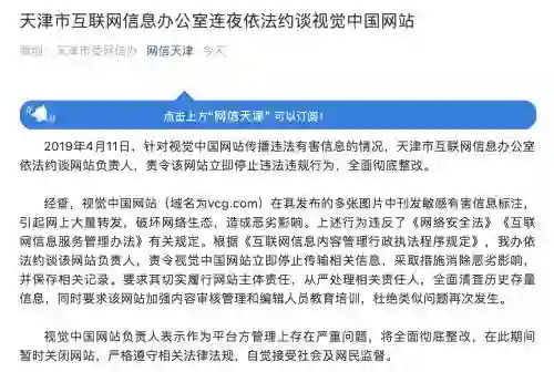 天津互联网信息办公室连夜约谈视觉中国,责令该网站立即停止违法违规行为,全面彻底整改。目前,视觉中国已经关闭网站整改,并发布公告称,“尚不能准确预计整改完成并恢复服务的时间”。受此消息影响,视觉中国今日开盘一字跌停。