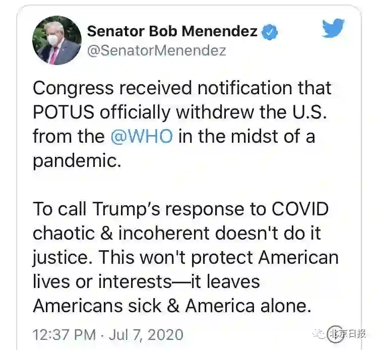 “国会收到通知,美国总统在全球疫情大流行期间,正式将美国从世卫组织中撤出。”美国国会参议院外交关系委员会成员罗伯特·梅嫩德斯 7 月 7 日则称,特朗普在新冠疫情应对中表现出“混乱和前后不一”,退出世卫组织的举动“不会保护美国人民的生命或利益,而是使美国人生病,使美国孤立无援”。