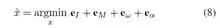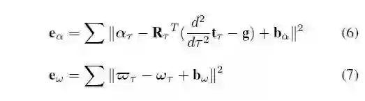 其中,a和上加横线的w为IMU的加速度和角速度信息,g为重力加速度,R,t,w为内插得到的旋转,平移和角速度信息,两个b为IMU的biases。