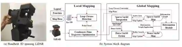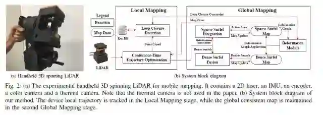 图1.(a)手持3D旋转LiDAR做移动测图。包括一个2D的激光,一个IMU,一个编码器,一个彩色相机还有一个热成像相机。热成像相机在文章中并没有使用。(b)文章SLAM系统流程图。Local轨迹计算是在Local Mapping步骤进行,Global Mapping模块生成全局一致的地图。
