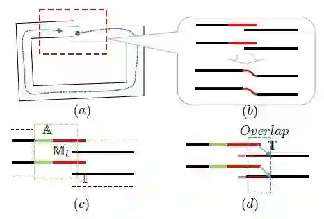 图3. (a)包含闭环的地图,红色实线代表最新的地图元素。(b)闭环的融合过程。上面是融合前,下面为融合后。(c) 在激活窗口内进行融合(绿色实线)。(d)激活和未激活区域的错误匹配的检测。
