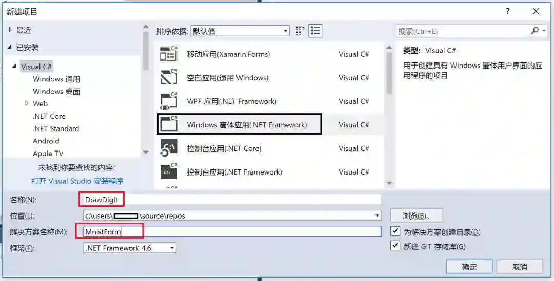 在弹出的窗口里选择 Visual C#->Windows窗体应用,项目名称不妨叫做 DrawDigit,解决方案名称不妨叫做 MnistForm,点击确定。