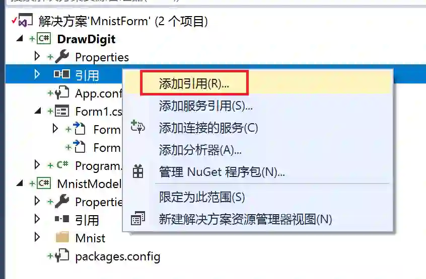 首先,我们来给 DrawDigit 添加引用,让它能使用 MnistModel。在 DrawDigit 项目的引用上点击鼠标右键,点击添加引用,在弹出的窗口中选择 MnistModel,点击确定。