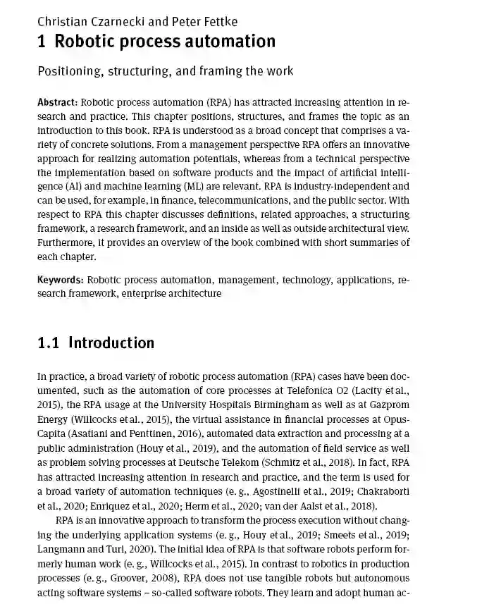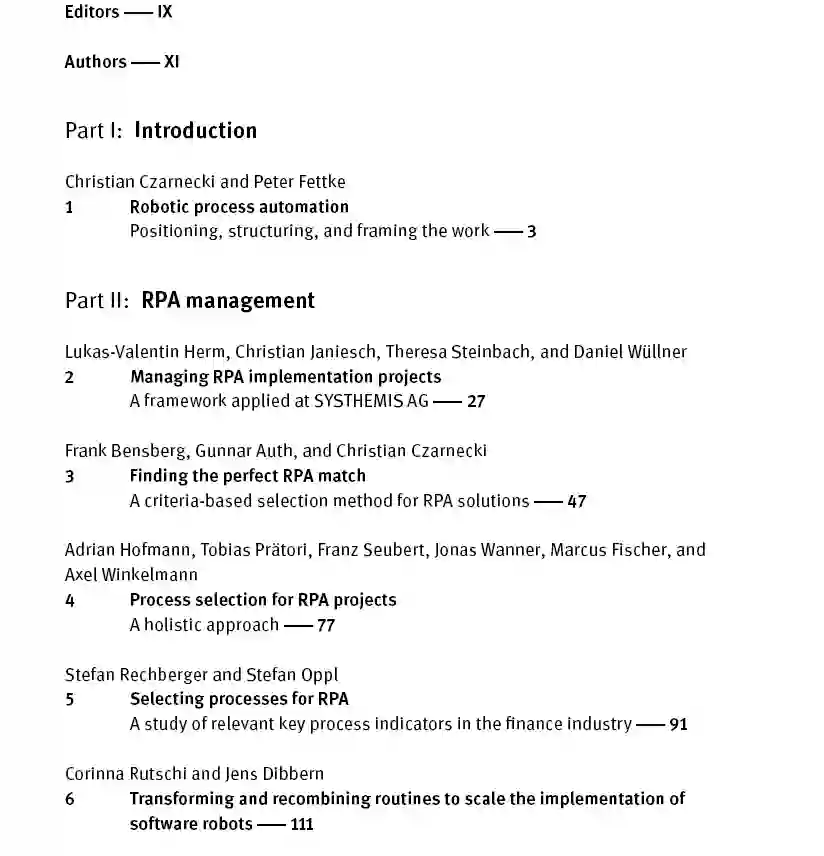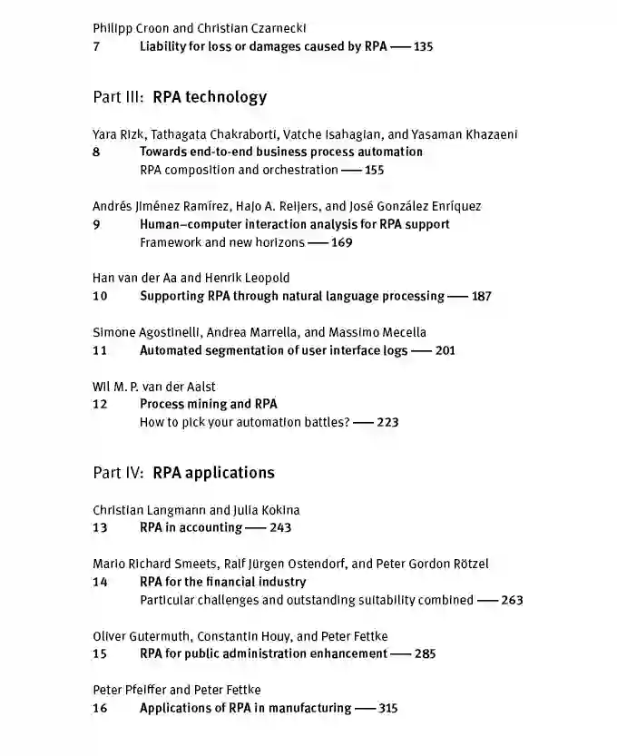 这本书汇集了来自研究和实践的专家。它包括创新机器人过程自动化(RPA)概念的设计,相关研究领域(如人工智能,AI)的讨论,现有软件产品的评估,以及现实生活中实施项目的发现。