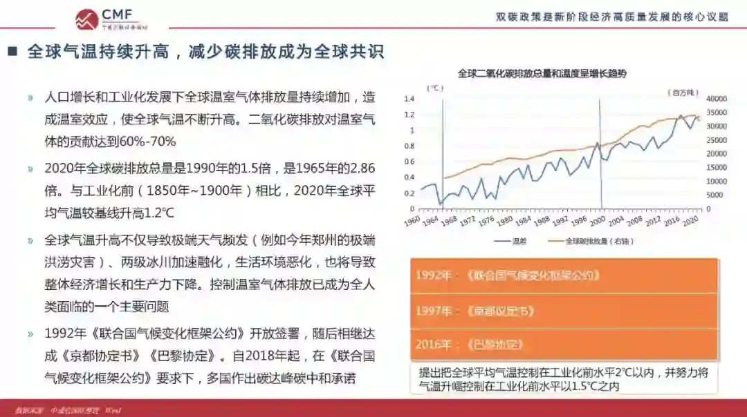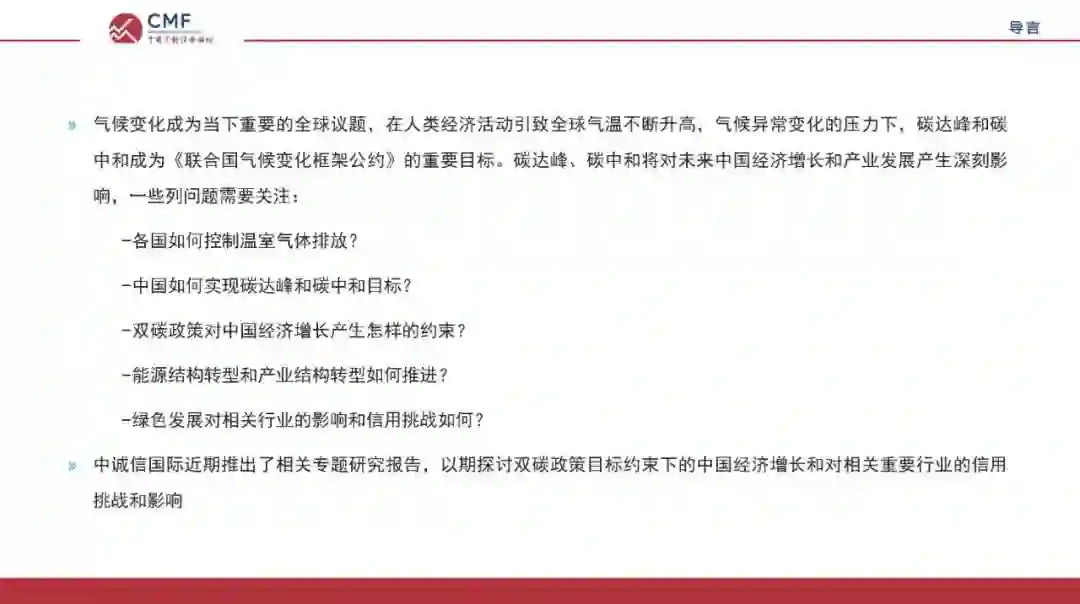 气候变化成为当下重要的全球议题,在人类经济活动引致全球气温不断升高,气候异常变化的压力下,碳达峰和碳中和成为《联合国气候变化框架公约》的重要目标。碳达峰、碳中和将对未来中国经济增长和产业发展产生深刻影响,一些列问题需要关注: