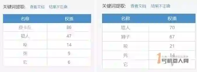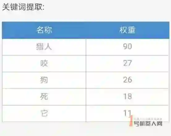 这时候,一个非常常见,原理简单的算法出现了,它就是TF-IDF。TF-IDF(term frequency–inverse document frequency)是一种用于信息检索与数据挖掘的常用加权技术。TF意思是词频(Term Frequency),IDF意思是逆文本频率指数(Inverse Document Frequency)。TFIDF的主要思想是:如果某个词或短语在一篇文章中出现的频率TF高,并且在其他文章中很少出现,则认为此词或者短语具有很好的类别区分能力,适合用来分类。举个栗子,在例句【咬死了猎人的狗】中,根据TF计算出的关键字是“猎人”、“咬”、“狗”“死”。由于是根据TF-IDF进行关键字提取的,以下一组句子的关键字提取结果是一样的: