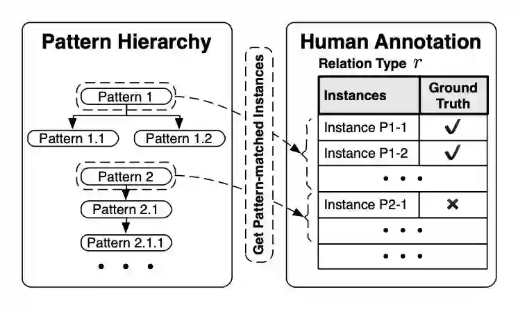 在模式精炼部分,我们首先构建一个模式层级结构用于高效遍历有代表性的模式,接着遍历模式层级结构(选取指定数量的模式)并采样出少量模式覆盖的样本用于人工标注。整体流程如下图所示,通过模式层级结构辅助模式选择以及人工标注来评估模式质量,我们可以得到具有高置信度的模式以及极少量的人工标注数据。