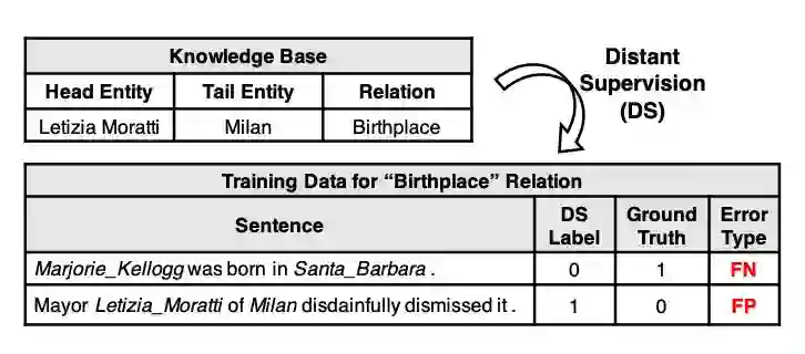 1. 第一个句子的确描述了实体间具有“出生地”的关系,然而由于知识库的不完整性,相应的远程监督标签(DS Label)是一个假阴性(FN)的错误;