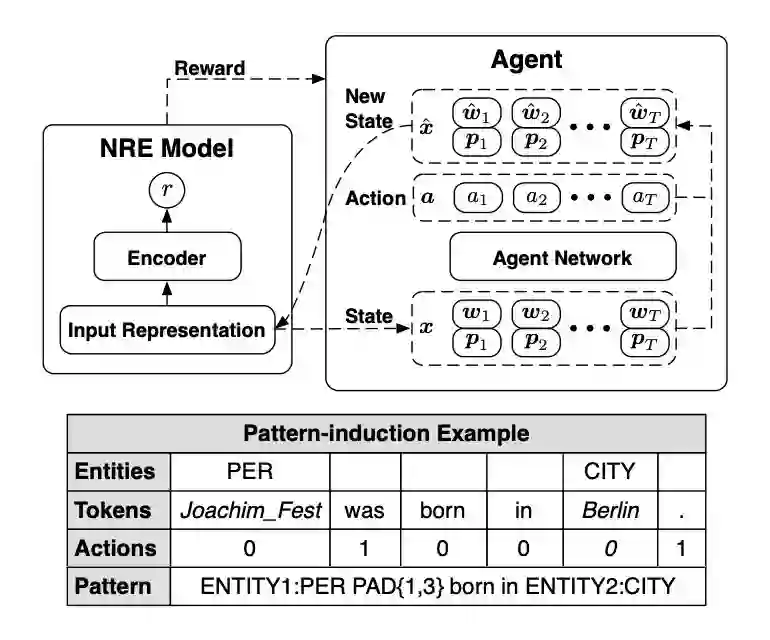 模式抽取部分的核心想法是通过强化学习训练一个代理网络(Agent Network)来获得关系相关的模式。