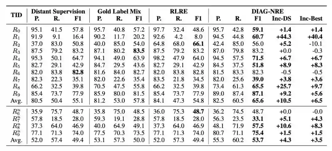 可以看出,在大部分的关系任务上,DIAG-NRE 相对于远程监督以及其他基线均取得了很大的提升,其原因主要来自于对如下两种标签噪声的抑制。