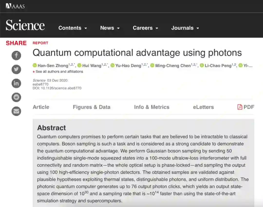 12月4日,中国科学技术大学潘建伟、陆朝阳等组成的研究团队发布了一项重磅研究成果:构建的76个光子的量子计算原型机“九章 ”,实现了具有实用前景的“高斯玻色取样”任务的快速求解。