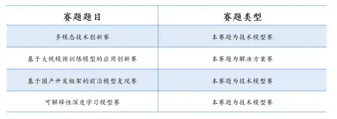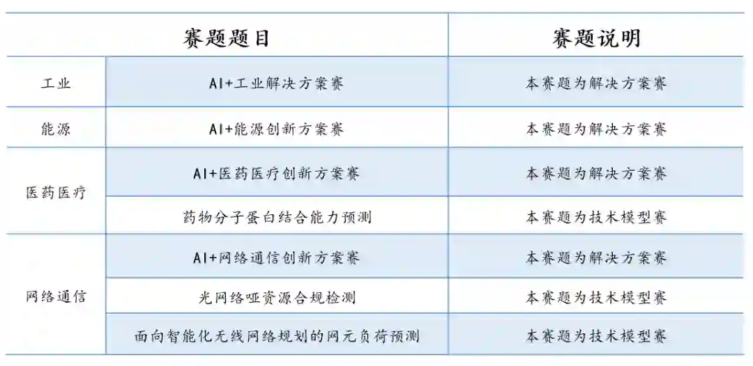 大赛设置技术创新、行业赋能和生态构建三大专题赛,每个专题赛设置若干赛题。这些赛题可以分为两个类型:技术模型题和解决方案题,两种类型基本各占赛题总数的一半。这充分体现了大赛主题「兴智赋能」中「兴智」和「赋能」的含义。