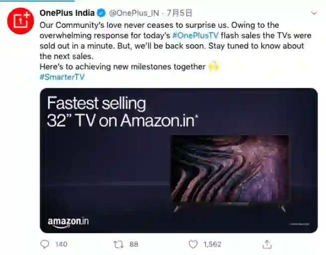 除此之外,一加近期在印度还发布了U系列和Y系列的安卓电视,其中U系列为55英寸4K机型,而Y系列则有43英寸和32英寸两个尺寸选择,两个尺寸皆为全高清机型。两个系列的电视主要都是以低价吸引用户,价格最低的Y系列32英寸机型售价仅为12999印度卢比(约合人民币1230元)。这三款电视在开售1分钟内便已售罄,市场的反应可谓相当不错。