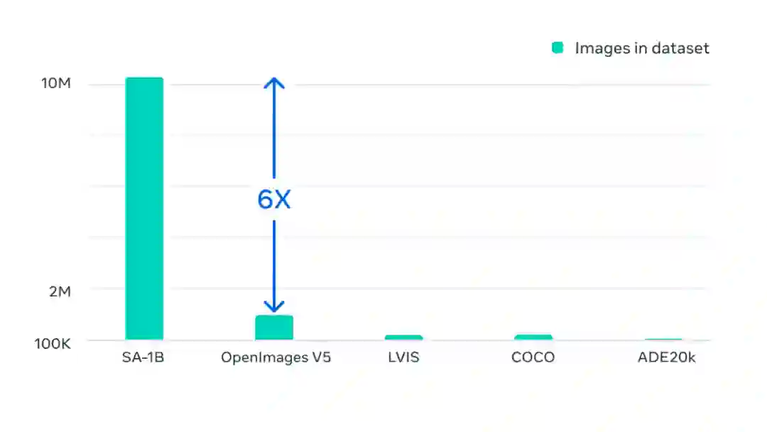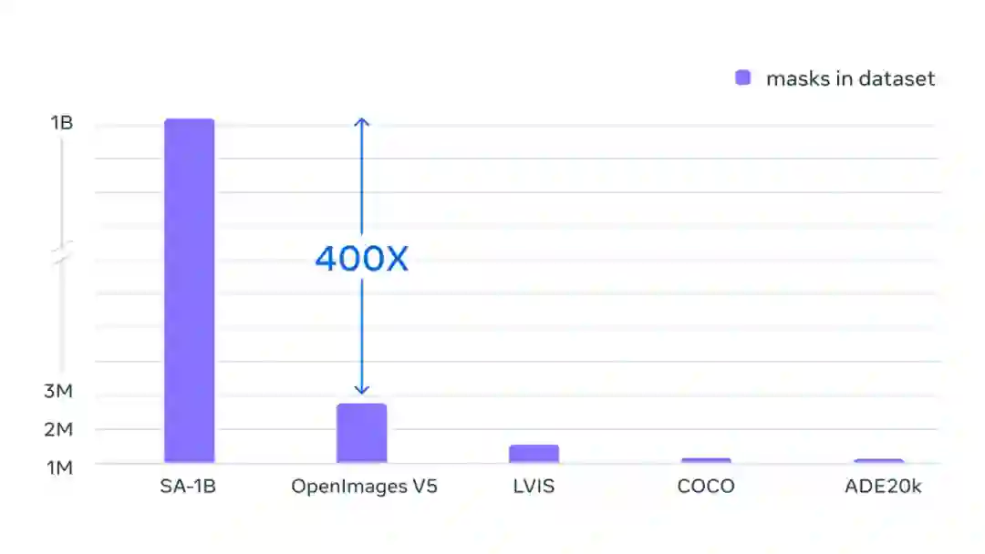 Segment Anything 对使用数据引擎收集的数百万张图像和掩码进行训练的结果,得到一个包含 10 亿个分割掩码的数据集,是以往任何分割数据集的 400 倍。