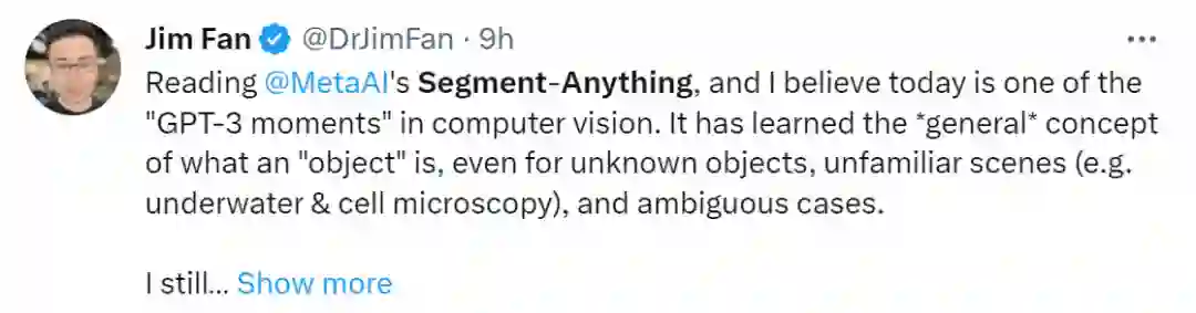 英伟达人工智能科学家 Jim Fan 表示:「对于 Meta 的这项研究,我认为是计算机视觉领域的 GPT-3 时刻之一。它已经了解了物体的一般概念,即使对于未知对象、不熟悉的场景(例如水下图像)和模棱两可的情况下也能进行很好的图像分割。最重要的是,模型和数据都是开源的。恕我直言,Segment-Anything 已经把所有事情(分割)都做的很好了。」
