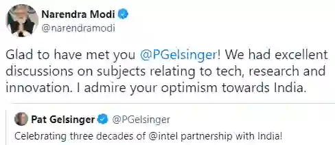 会见结束之余,4月7日的下午1点,帕特发送推文,「祝贺英特尔和印度30年的伙伴合作。」