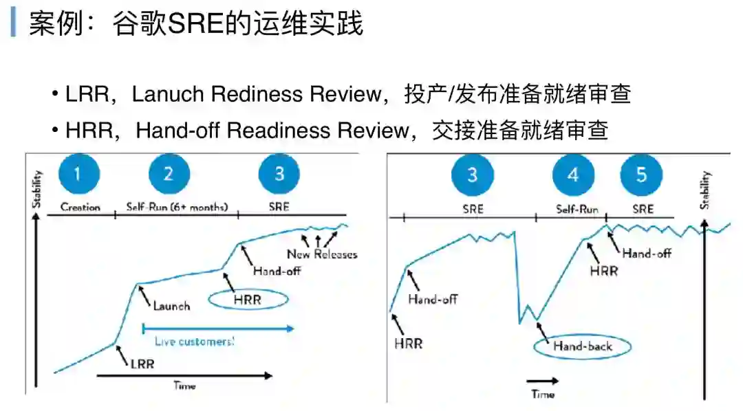 当走完LRR节可以走到发布投产的环节,发布投产的环节就要走HRR,HRR是什么,用国内的话就是开发把这个服务交接给运维,交接的过程SRE就要来评审,开发是不是符合运维规定的非功能规范,全部做到了,可以进行Hand-off交接,就是开发放手交给运维。