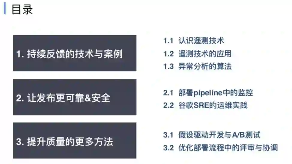 第一是持续反馈的技术与案例,介绍在持续交付之后构建持续反馈体系的方法,主要是监控和告警能力的建设。