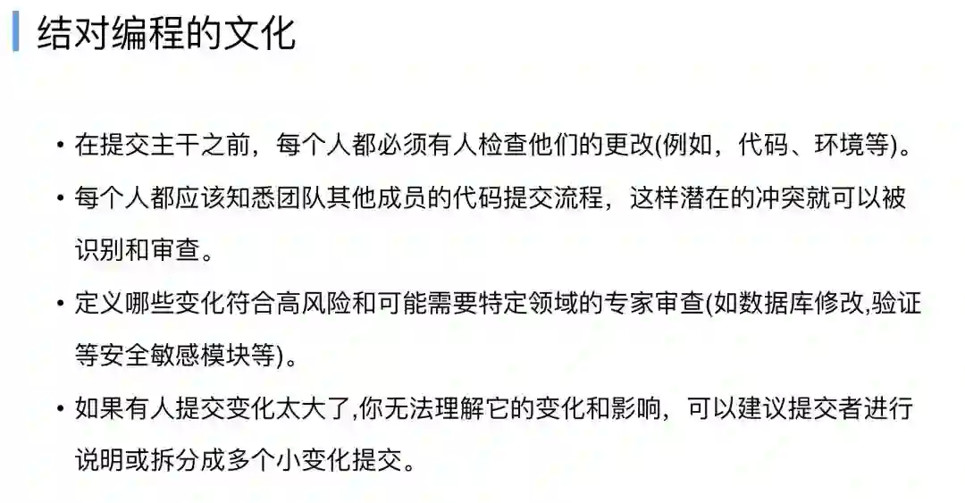 结对编程文化有很多好处,也有很多规则,他要求大家一定要提交到主干之前都要交叉检查,你的代码环境有没有什么依赖变化,有没有一些冲突等,一定要定义清楚你是不是有高风险的,如果你认为你这个代码有安全问题,其实是应该有安全专家评审过的。
