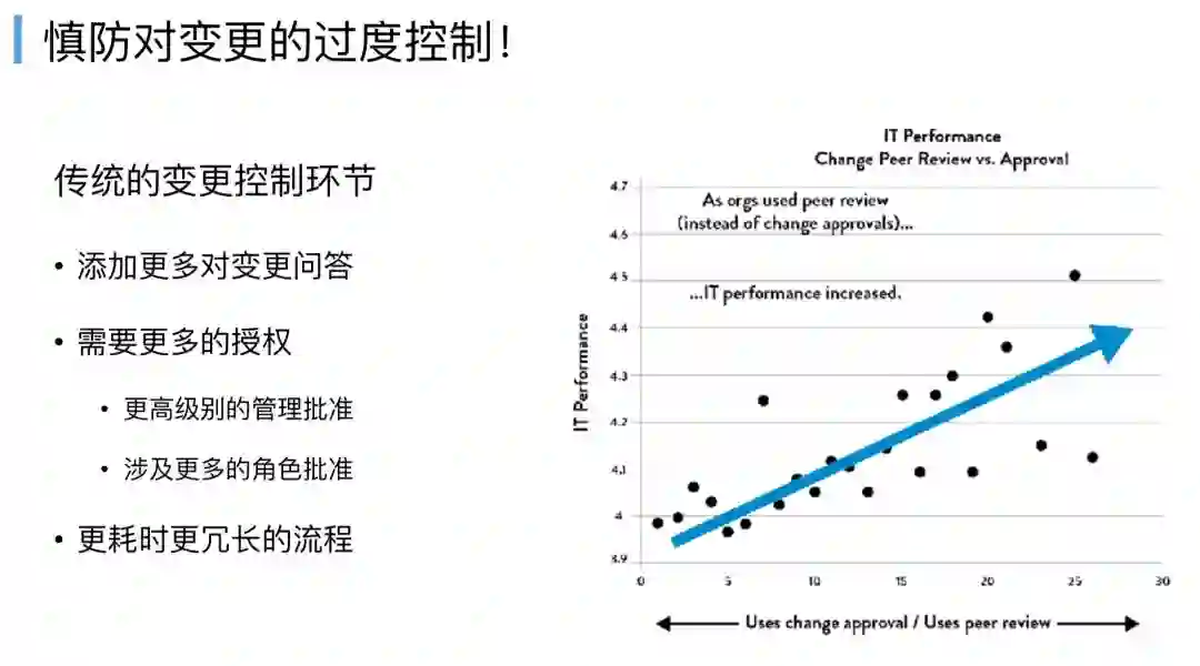 这是一个谷歌的案例,这个案例有一条蓝线,往左边的黑点代表审批环节,往右边的黑点代表同行交叉检查环节,越采用交叉检查的代码质量越高,IT的效能越高,这远比走一个僵化的审批流程来得要快,况且很多审批流程,其实又是康威定律作用的,组织架构决定软件架构,既然设立了这样的一个组织,它就必然要去发挥它的价值(刷存在感),就一定要去审批,因为该组织存在就是为了审批的东西。