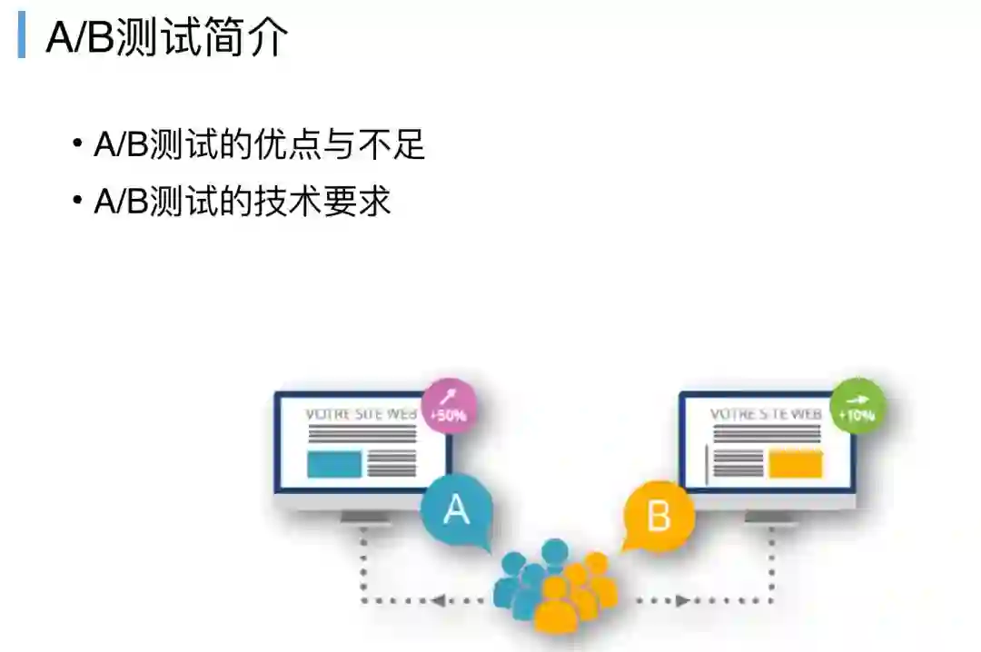 A/B测试有一个好处,就像这个图举例,我们对我们的用户群体来做一些样本测试,就像上面这个图,我们是左边放图片还是右边放图片,左边放图片,业务的指标提升了50%,右边放图片只提升了10%,很明显要用左边这个方案。