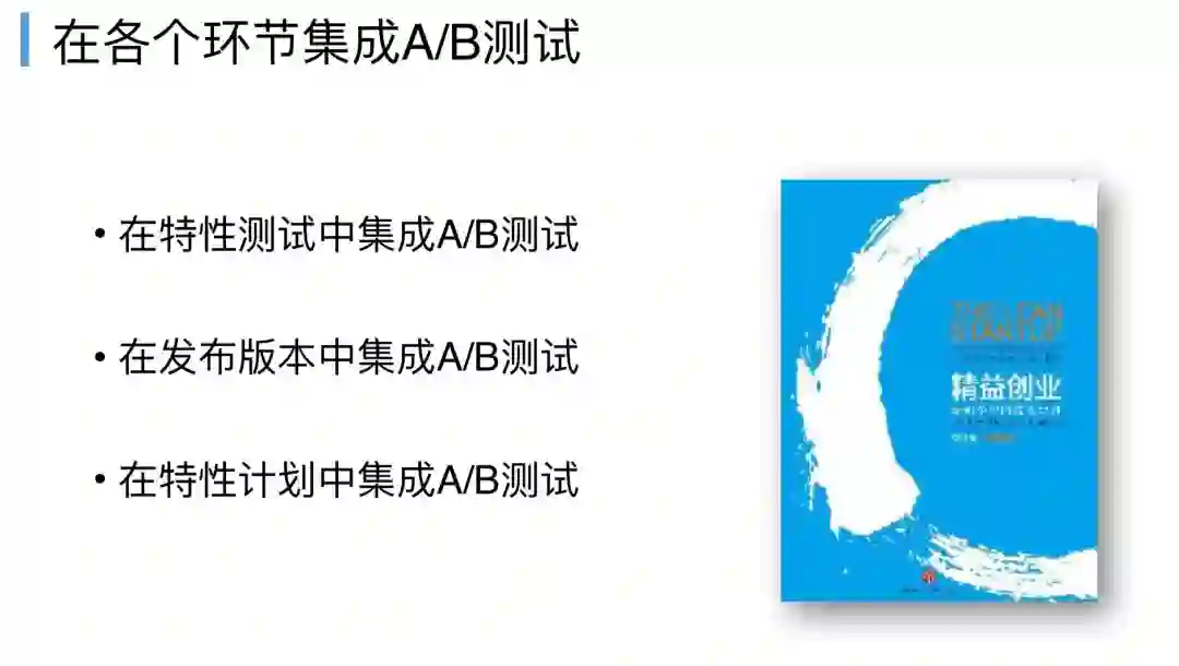 换成另一个方案,在特性计划的时候,产品经理规划一个新特性,一定要考虑A/B测试的因素在,这个其实是一个市场营销、用户体验、用户设计等范畴。《DevOps Handbook》推荐了一本《精益创业》,如果大家有负责产品规划,推荐要看一下这本书,讲到了很多方法论,做toc产品怎么做,做tob产品怎么做。
