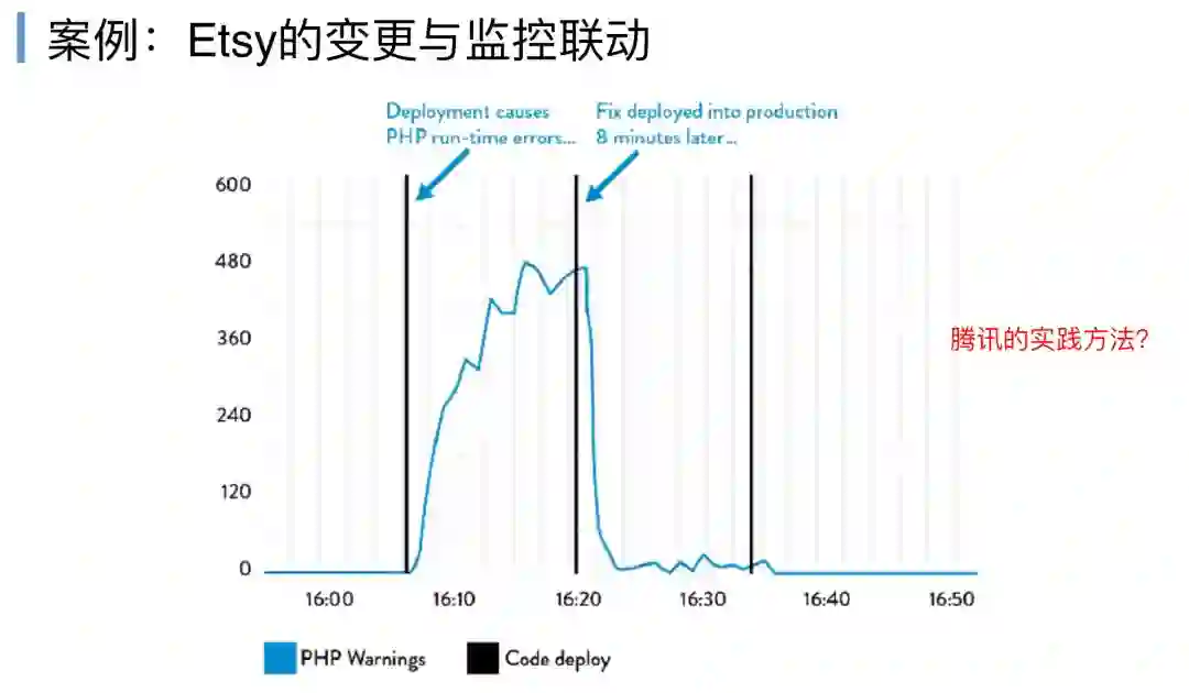 Etsy的案例,黑色线是部署PHP,部署完之后,16点过一点,在这个点部署部署完,PHP告警马上陡增,马上再发布一个东西,然后告警下降,修复了,用更频繁的部署,他每次部署就10分钟,更频繁的部署换来影响更小,我们可以做得更快更可控。