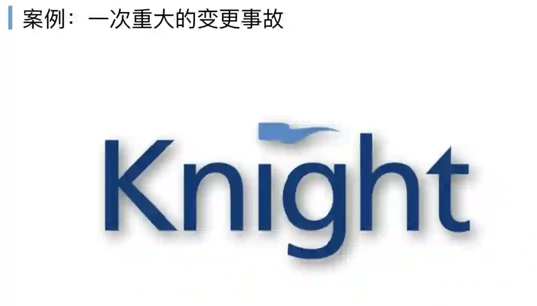 这里讲到一个案例,骑士资本,一家做VC业务的投资公司。当年他们有一个很经典的发布,因为一个发布的失败,影响了15分钟,导致他们15分钟交易损失了4.4亿美金。