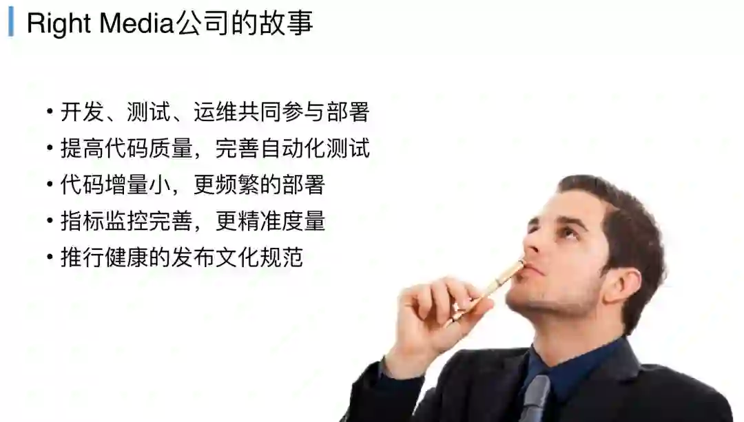 所以Right Media后面做了一个很大胆的改革,他要求每一个步骤动作有由开发、测试、运维共同参与,这个其实也是DevOps提供的,甚至是开发都可以去部署。
