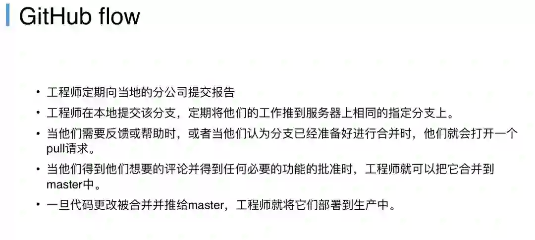 GitHub公司自己实践出来的,这个特性也在很多GitLab、GitHub都有这种形式,GitHub flow,标准代码提交的过程,应该是什么样子的,首先它是定期的,提交这个代码分支一定要有版本的说明,当他提交完之后会有一个拉请求,去做自动化的编译、测试等等。