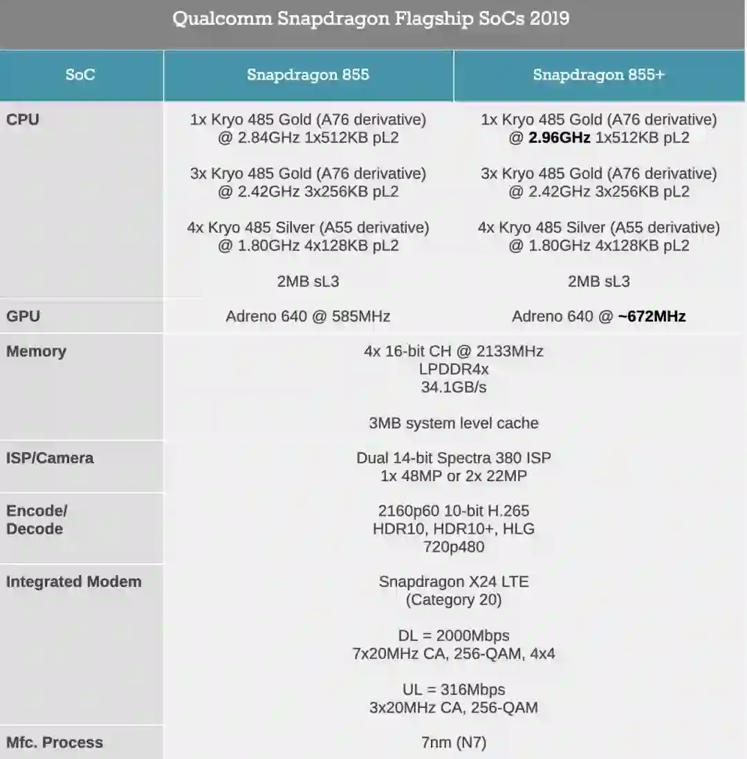 7月15日,高通推出了骁龙855 Plus。从名字上就能看出,它就是骁龙855的增强版。实际上,这波牙膏挤得相当勉强,CPU 主频略微提升,GPU 超了个频,其他保持原样。
