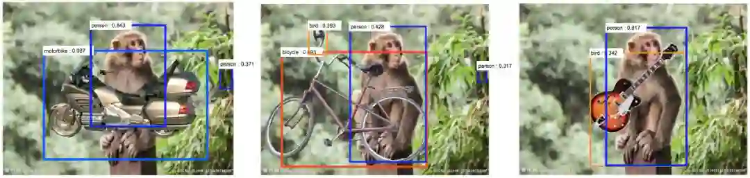 图 3:(来源) 添加遮挡器导致深度网络失败。左图:用摩托车进行遮挡后,深度网络将猴子识别为人。中间:用自行车遮挡后,深度网络把猴子识别为人,丛林把网络对自行车把手的识别误导为鸟。右图:用其他遮挡后,深度网络将猴子识别为人,而丛林将网络对吉他的识别误导为鸟。