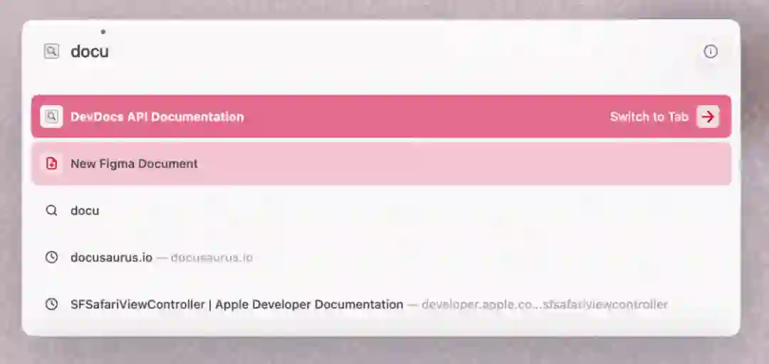 这种强迫三思后行的设计,很好地避免了无头绪时下意识打开标签的行为。很多时候,你输到一半就会发现之前打开过一样的标签了,Arc 此时也会贴心地提供切换过去的选项。