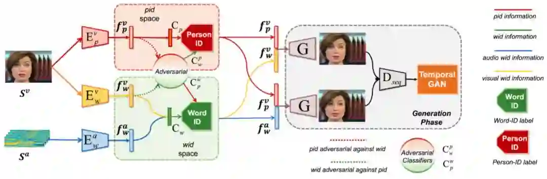 在这项工作中,作者将两方面整合一起开展了一系列研究,并提出了一种 DAVS (Disentangled Audio-Visual System)结构。通过学习分解的视觉和听觉表征,实现对任意说话主体的脸部生成。我们假设说话人的脸部序列是主体相关信息和语音相关信息的组合,通过一种新颖的关联-对抗训练过程来明确地解开这两个空间。这种分解方法的另外一个优点就是能将分解得到的音频和视频信息都可以用于语音信息的生成。大量实验表明,作者所提出的方法可以对任意对象上生成逼真的人脸序列,并且唇部运动模式更加清晰。此外,作者还发现,学习到的视听表征在唇语自动解读和音频视频检索等应用中也非常有用。